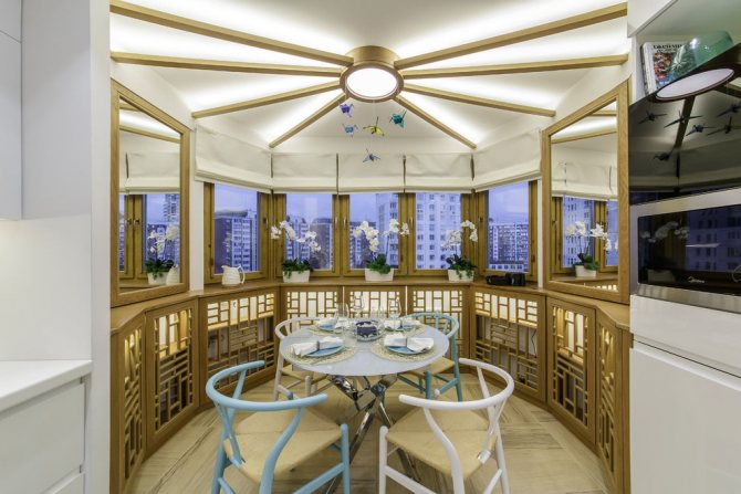Pour la décoration, des rideaux classiques avec un lambrequin, des rideaux romains, français, autrichiens ou diverses options de protection solaire conviennent. Les modèles en tissu vous permettent de lisser les coins prononcés de la baie vitrée. Une baie vitrée rectangulaire peut être formée par réaménagement et alignement avec une loggia ou un balcon.