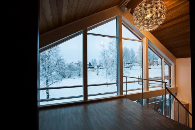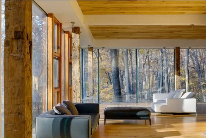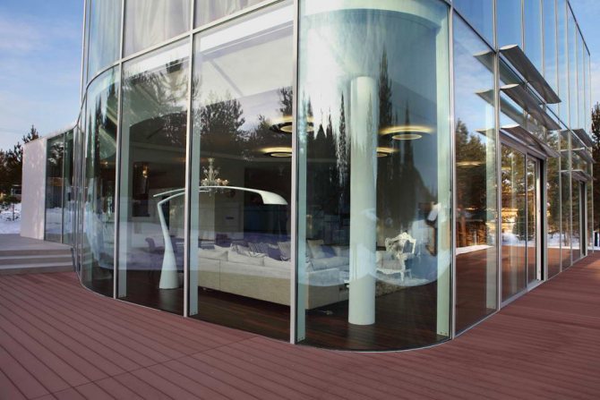 Le verre transparent est très demandé. Le cadre d'un tel matériau est en bois lamellé-collé avec une peinture caoutchoutée, qui se distingue par sa fiabilité et sa durabilité. L'élément principal est les fenêtres à double vitrage. Ils, basés sur l'idée du projet, peuvent être constitués d'une boîte ou inclure des cloisons. La réception vous permet d'obtenir le maximum d'effet d'unité avec le monde extérieur.