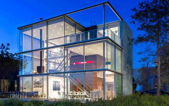 Ne pensez pas que le verre utilisé pour la construction d'une maison est un matériau traditionnel à haute conductivité thermique. Le verre moderne utilisé à ces fins présente de nombreux avantages. Par exemple, avec son aide, il est facile de maintenir le régime de température requis dans la maison tout au long de l'année. En outre, assez souvent à ces fins, des fenêtres à double vitrage avec panneaux solaires intégrés, ainsi qu'un système autonettoyant, sont utilisés.