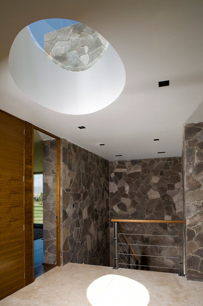 Chaque concept de design doit avoir une saveur, et ce projet ne fait pas exception. Au deuxième étage, près de l'escalier, il y a une ouverture panoramique au plafond à travers laquelle les rayons de lumière pénètrent pendant la journée, et la nuit, vous pouvez admirer le ciel étoilé.