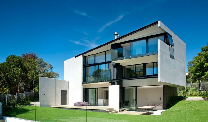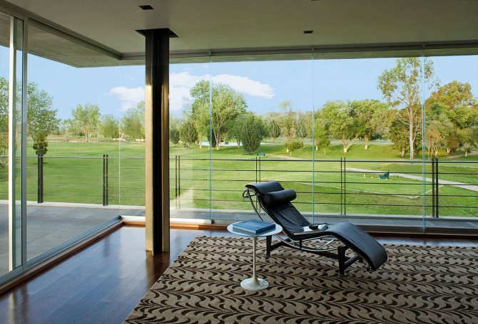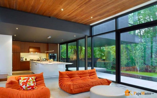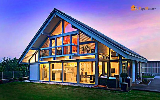L'aspect du bâtiment est très attrayant. Même s'il s'agit d'une grande maison de 2 à 3 étages, elle semblera très gracieuse et légère, presque en apesanteur. Dans le même temps, l'absence de murs opaques agrandira visuellement absolument n'importe quelle pièce de la maison.Toute la lumière naturelle sera utilisée au maximum et il ne sera pas difficile de se protéger de son surplus avec divers rideaux et stores.