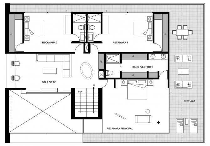 Les chambres, chambre d'enfants, home cinéma, salle de bain sont à l'étage. Pour donner de l'intimité à l'espace, les fenêtres utilisent une grille en bois en forme de persienne.