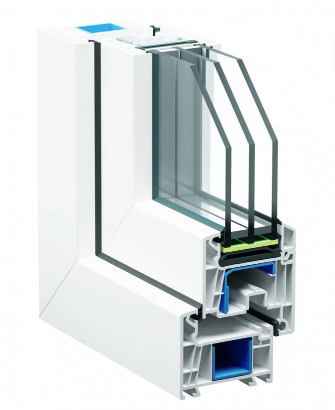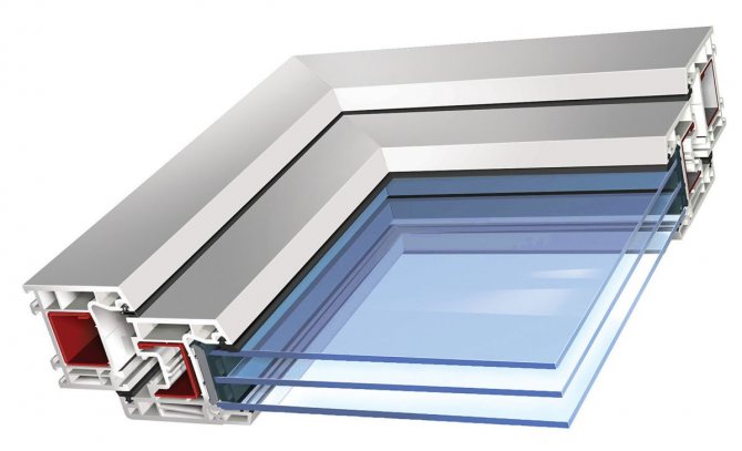 Profil à cinq chambres - le nombre de chambres dans la section des lignes bleues est de cinq, le nombre de chambres dans la section de la ligne rouge est le même trois, cela suggère que le plan de connexion du cadre avec l'ouvrant s'annule l'avantage de cinq chambres et réduit le coefficient de conductivité thermique au niveau du profil à trois chambres.