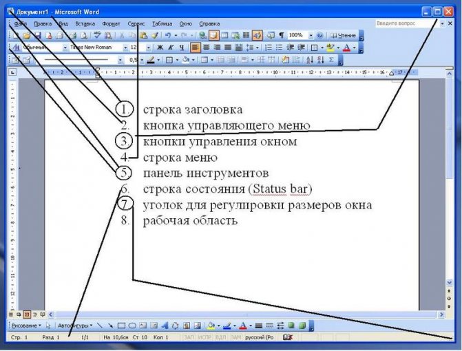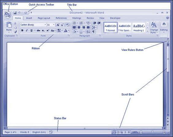 · Barre d'état. Situé en bas de la fenêtre (sa présence est due aux paramètres de la fenêtre ou du programme). Il affiche les informations de service. Ainsi, dans MS Word, la barre d'état affiche le nombre de pages et de sections du document, la langue du texte et d'autres informations.