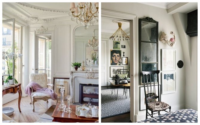 La fusion de l'ancien et du nouveau dans le style français s'incarne principalement dans le mobilier. Les Français sont de grands amoureux de l'antiquité. Ce peut être un miroir ancien, rayé, terni avec le temps, dans un cadre doré, acheté aux enchères pour une somme énorme, ou ce peut être une table vintage, achetée à une brocante ou héritée, avec des taches de café dessus.