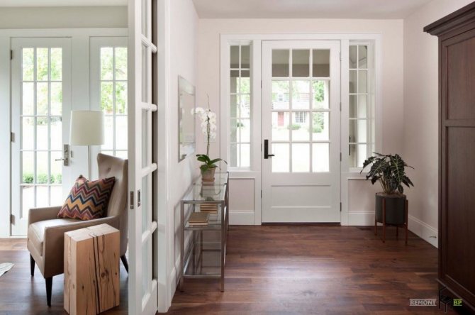 Les préférences gustatives de chaque famille sont différentes: quelqu'un choisit une porte transparente au sol, d'autres préfèrent un modèle avec un panneau sandwich. Certaines personnes aiment la texture naturelle et les nuances comme le bois, d'autres sont classiques: blanc, gris et pas contre le plastique.