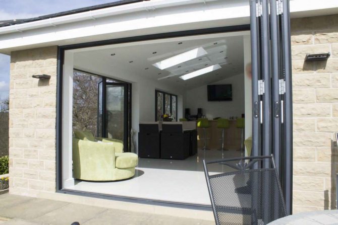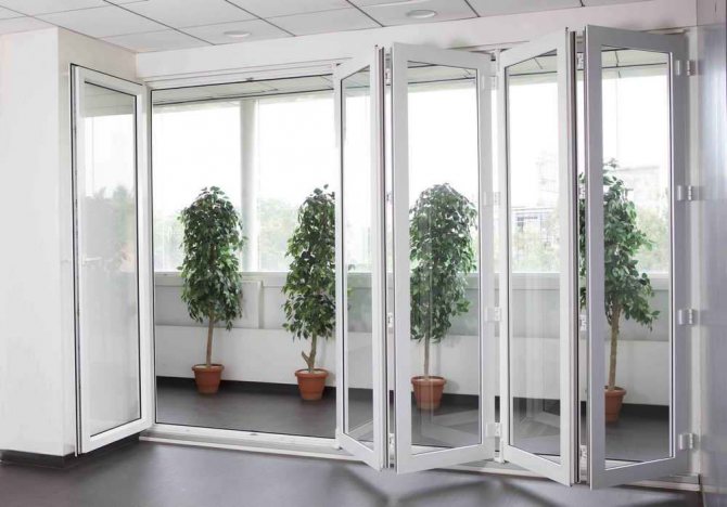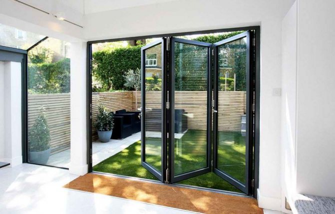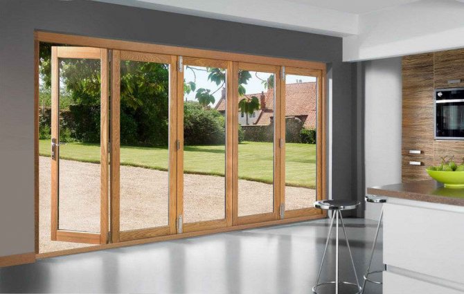 Il fonctionne également comme une porte, mais la différence réside dans la façon dont la porte est ouverte. Dans ce cas, la porte s'ouvre par coulissement - se plie comme un accordéon, permettant un large passage. Les fenêtres accordéon pliantes sont populaires dans les grands espaces.