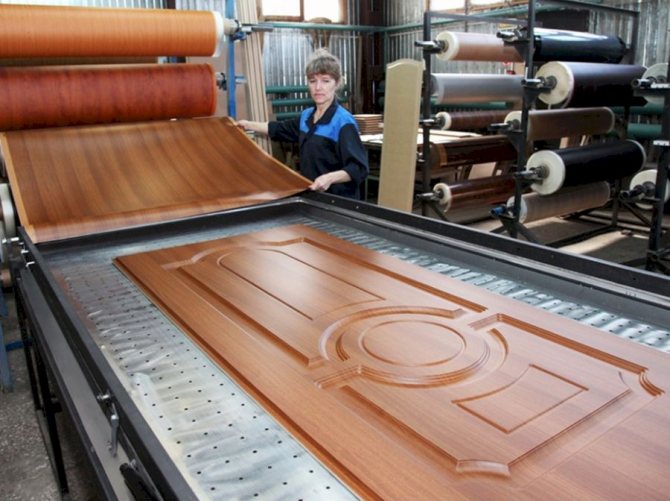 Pour assurer une adhérence fiable du film à la base, un équipement spécial est utilisé. Avant la production de PVC, le film est nettoyé et dégraissé avec une haute qualité. Le vantail de porte avec le film est placé dans une chambre spéciale. Après cela, la température dans la chambre commence à augmenter, sous l'influence de laquelle le revêtement en PVC devient mou, prenant n'importe quelle forme. Le film est pressé grâce à la pression créée dans le vide... grâce à quoi le polychlorure de vinyle est fixé qualitativement sur le produit.