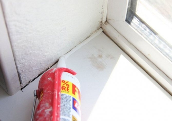 - Le rebord de la fenêtre et les garnitures de fenêtre sont retirés. Tout est soigneusement nettoyé et séché. Le traitement est effectué avec des produits contenant du chlore. Tous les trous et crevasses sont remplis de mousse ou de composés d'étanchéité. La surface est apprêtée avec un agent spécial, par exemple "Ceresit ST 99". Le rebord de la fenêtre et les garnitures sont remplacés.