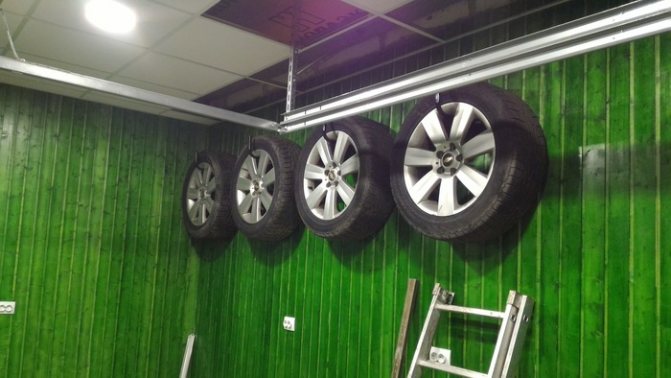 Noter! Il est également bon de suspendre les pneus d'hiver, s'ils sont avec des disques, des crochets ou des supports, chaque roue séparément.