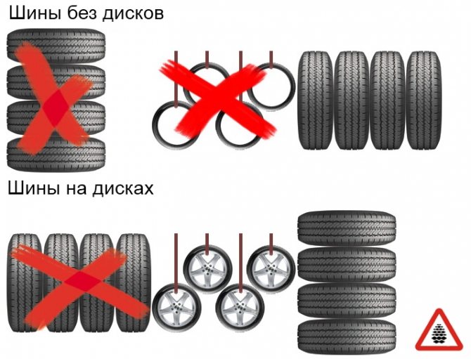 Important! Si les roues d'hiver n'ont pas de disques, les pneus doivent être placés verticalement, les uns à côté des autres.