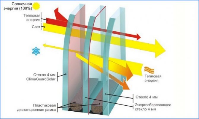 Le verre est appelé à économie d'énergie, à la surface duquel une couche transparente d'oxydes métalliques est pulvérisée. Le métal conduit moins bien la chaleur que le verre, de sorte que la chaleur qui traverse le verre est retenue par la couche pulvérisée et est réfléchie dans la pièce.