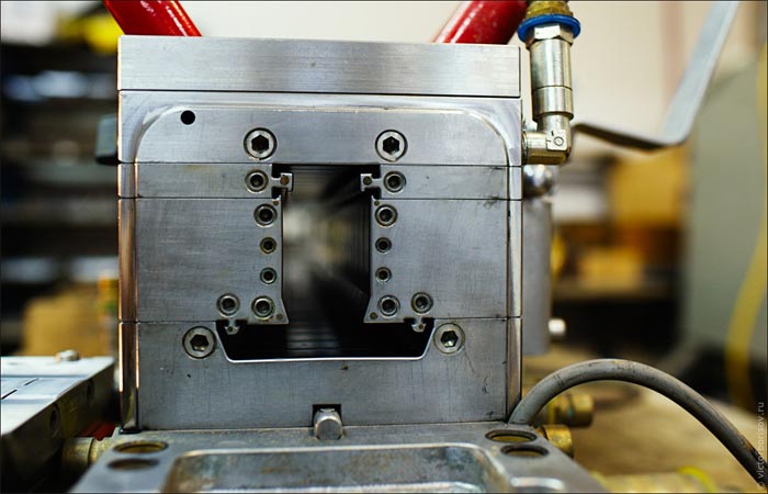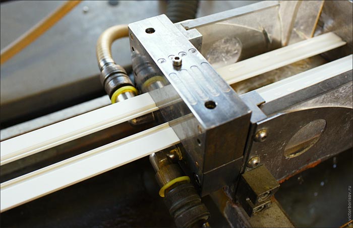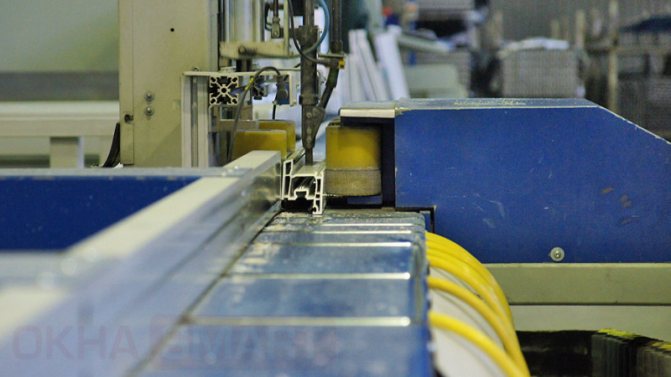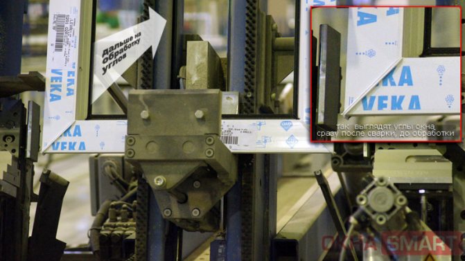 De plus, le profilé en plastique coupé VEKA va à un complexe de soudage semi-automatique à 4 têtes, où les coins de la future structure de fenêtre sont soudés à une température de 250 ° C.
