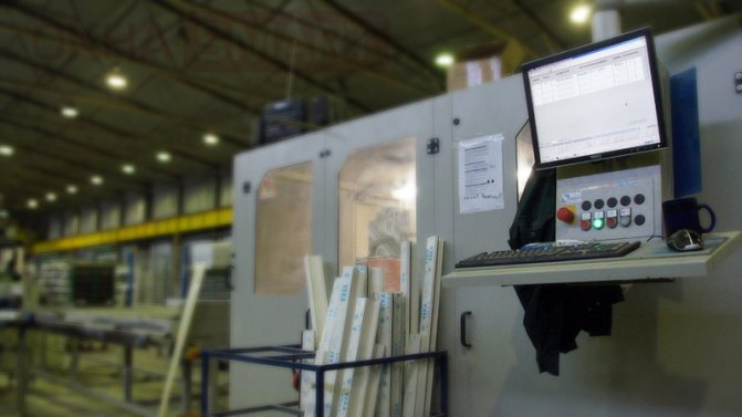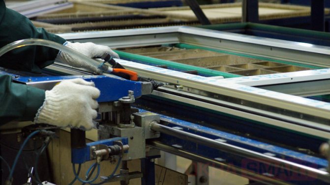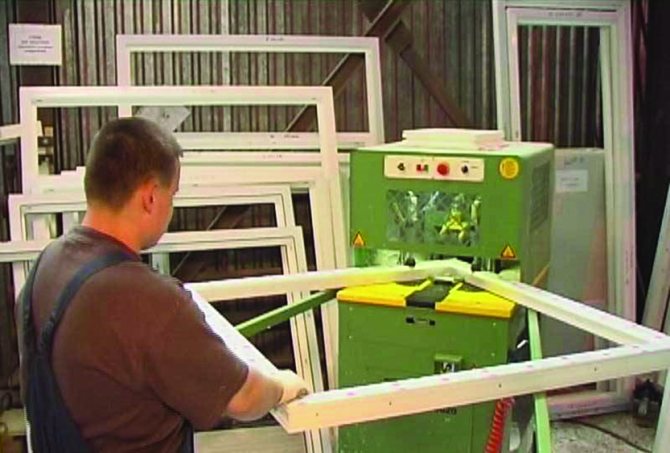 Exactement comme dans la production de fenêtres en bois, une barre de bois est sciée en morceaux de la longueur requise puis traitée sur une machine à tronçonner, le profilé en plastique doit être coupé précisément sur la longueur, puis coupé à 45 degrés, pour poursuite de la soudure des coins, insérez et fixez le renfort métallique, faites tous les trous nécessaires pour les poignées, etc.