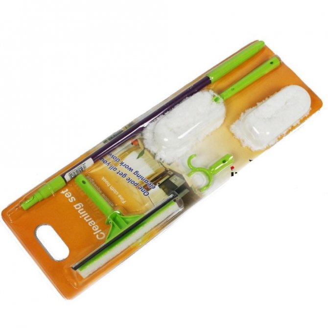 Lors de l'achat d'un slip, l'ensemble comprend un manteau de fourrure et une brosse de nettoyage. Ces outils vous aideront à nettoyer les fenêtres de toutes formes et tailles sans aucun problème. La brosse a un angle d'inclinaison de 30 degrés et son mécanisme permet de faire pivoter l'outil de 180 degrés. Par conséquent, l'hôtesse peut facilement laver la structure même de la configuration la plus complexe. La buse en microfibre sur le slime nettoiera doucement l'unité en verre, ne laissant aucune peluche dessus.