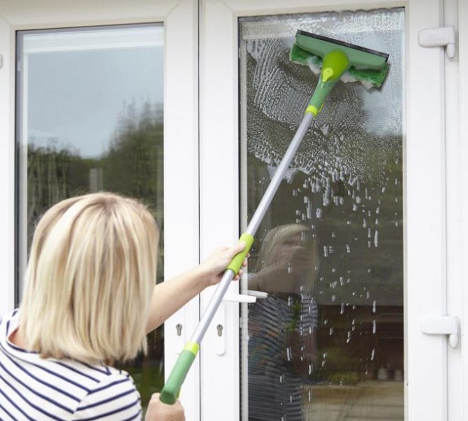 Cette vadrouille aide à nettoyer le verre à des hauteurs élevées. Il existe des modèles qui glissent jusqu'à 2 mètres. - Lave-vitres avec un spray, qui sont équipés d'un vaporisateur pour solution de nettoyage.