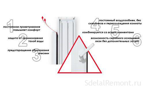 L'avantage incontestable du vitrage PVC est son étanchéité. Et cette même fonctionnalité est un peu problématique. En maintenant la température dans la pièce, les fenêtres en métal-plastique ne laissent pas non plus passer l'humidité et ne fournissent pas un afflux d'air frais. La fonction de micro-ventilation aidera à se débarrasser de ce problème.
