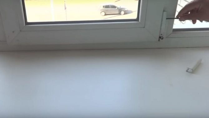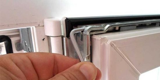 La partie supérieure de l'ouvrant est attachée d'une manière différente, à un mécanisme spécial appelé "ciseaux". Pour accéder à la partie supérieure, la fenêtre est ouverte et à l'extrémité du châssis, le mécanisme de verrouillage est enfoncé (il est fixé à un angle par rapport au joint en caoutchouc et est élastique).