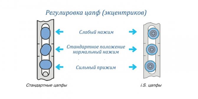 Le châssis de la fenêtre est pressé contre le cadre avec des goupilles. Ce sont de telles saillies métalliques mobiles sur la surface latérale du châssis. Lorsque la poignée est tournée, ils passent derrière les contre-plaques métalliques installées sur le cadre. Afin de pouvoir ajuster l'étanchéité du châssis et du cadre, ils ont un excentrique - soit ils sont de forme ovale, soit au centre de la saillie ronde, il y a un réglage avec un centre décalé. En changeant la position des goupilles (voir photo), vous modifiez le degré de pression, c'est-à-dire que vous éliminez le courant d'air sous le châssis.
