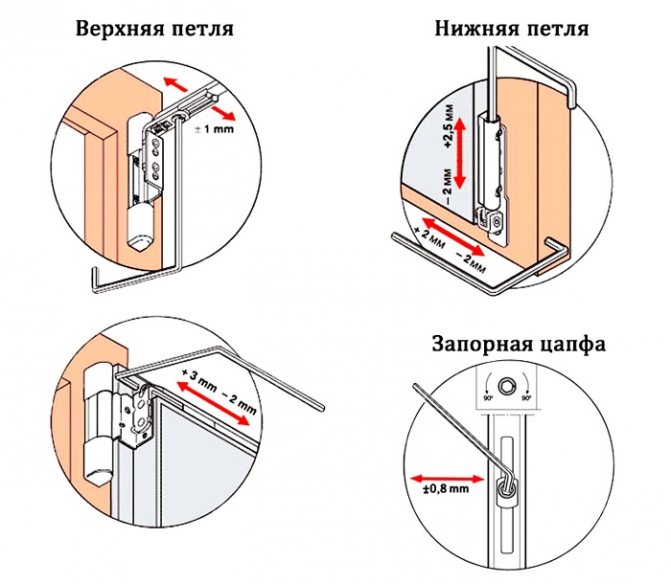 Pour rapprocher ou éloigner la partie inférieure de l'ouvrant de la charnière, celle-ci est ouverte. Au bas de la chanson, il y a un trou de réglage pour une clé hexagonale (parfois - pour un "astérisque").