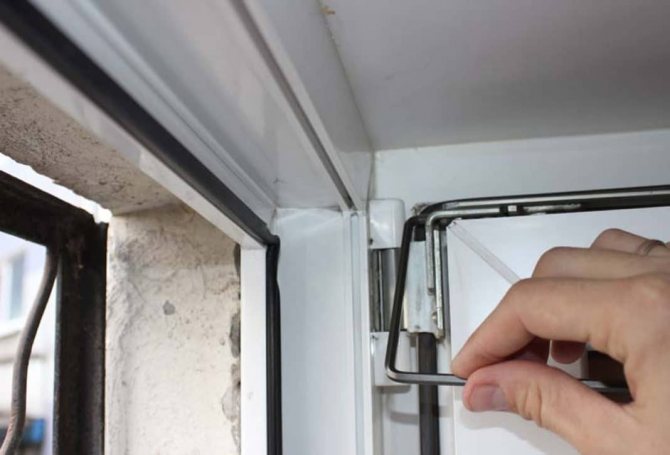 Si le coin supérieur ne se ferme pas sur la fenêtre en plastique, vous devez le déplacer... Pour ce faire, ouvrez la fenêtre à au moins 90 °. Moins est possible, mais il ne sera pas pratique de travailler. Il y a une charnière sur la ceinture en haut. Son design diffère de celui du bas, mais il comporte également un trou pour un hexagone.