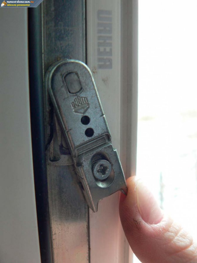 Parfois, cet ajustement n'aide pas non plus. Ensuite, il faut appuyez le coin supérieur contre le cadre. Pour cela, il y a une autre vis - sur le mécanisme pivotant. Pour avoir accès à cette vis, vous devrez ouvrir la fenêtre dans deux positions à la fois. Pour ce faire, ouvrez le châssis, appuyez sur le bloqueur. Il se décline généralement en deux modèles - sous la forme d'une boucle de verrouillage ou d'une languette (voir la photo ci-dessous).