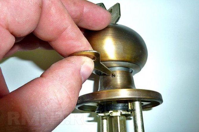 Si nous parlons de démonter une poignée ronde avec une douille, il est nécessaire de préciser que le mot "douille" est généralement compris comme un mécanisme qui permet de verrouiller la serrure à l'aide d'une petite clé d'un côté, qui n'est pas utilisée d'un autre côté. Il y a un agneau spécial sur le deuxième côté.