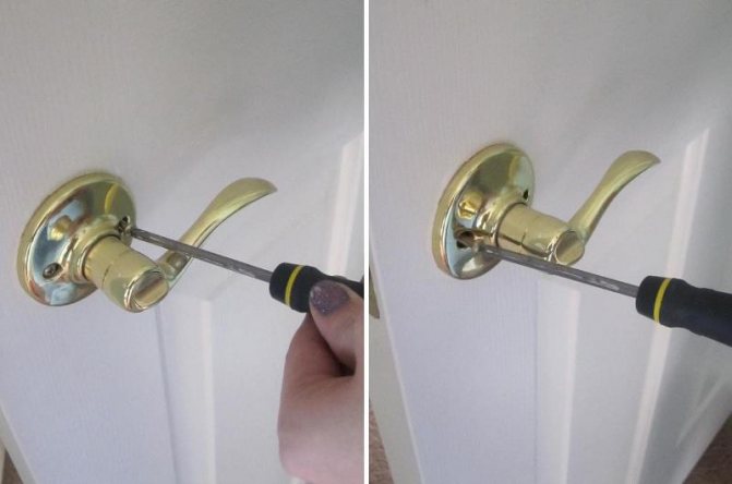 Noter. Il est parfois nécessaire d'appuyer sur le bouton, surtout si la poignée est oxydée ou obstruée par de la poussière comprimée. Lorsque vous appliquez une force, soyez prudent - la pointe du tournevis peut facilement se détacher du bouton et rayer la poignée. Il n'est pas difficile de tracer le chemin ultérieur du tournevis - il s'enfoncera dans la paume ou le doigt de l'autre main tenant la poignée.