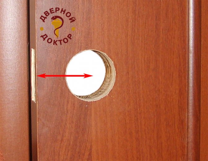 Vous devez d'abord faire un trou cylindrique traversant. Pour ce faire, utilisez un ruban à mesurer pour mesurer une distance de 1 à 1,2 m du sol et faites une marque avec un crayon. À partir de l'extrémité de la porte, mesurez la distance égale à la longueur du mécanisme de verrouillage. Vous pouvez mesurer le mécanisme avec une règle ou voir ses paramètres dans les instructions du fabricant (tous les dessins doivent être là). Le point d'intersection résultant sera le centre du trou.