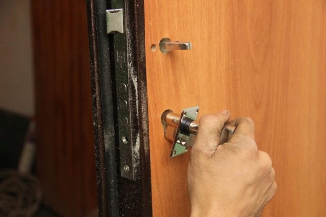 Si le mécanisme ne peut pas être réparé, il est nécessaire de remplacer la poignée de porte avant par une autre. Pour commencer, un loquet est inséré dans le trou d'extrémité, qui est vissé avec des vis autotaraudeuses des deux côtés. Après avoir installé le loquet, vous devez nettoyer le trou des débris de construction. Cela peut être fait avec un jet d'air, comme un sèche-cheveux.