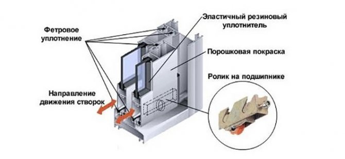 Grâce à eux, les châssis se déplacent le long des guides. Le verre est inséré dans la toile avec un joint en plastique.
