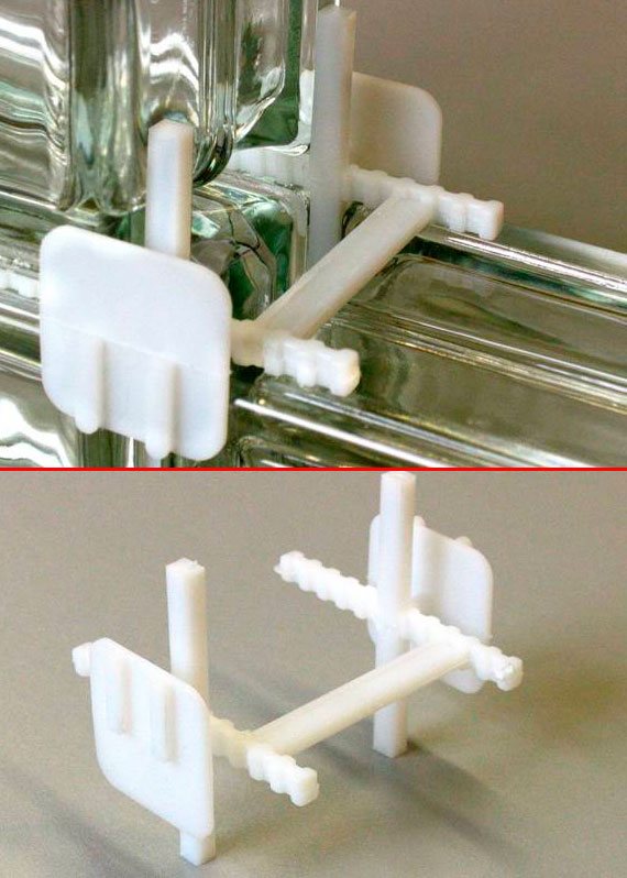 Des croix spéciales fournissent les mêmes joints entre les blocs de verre et après l'achèvement des travaux d'installation, ils restent murés dans la maçonnerie de blocs de verre. Avec la méthode traditionnelle d'empilage des blocs de verre, seules 3 à 4 rangées de blocs de verre peuvent être empilés en une seule fois.
