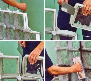 Lors de l'installation de blocs de verre, il est conseillé d'utiliser des solutions adhésives blanches afin que la couleur des blocs de verre eux-mêmes ne change pas, et également lors de l'utilisation de solutions à base de ciment blanc, à l'avenir, des joints plus esthétiques entre les blocs de verre seront obtenus.