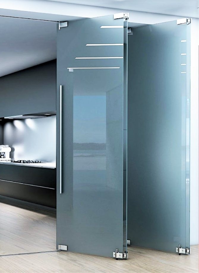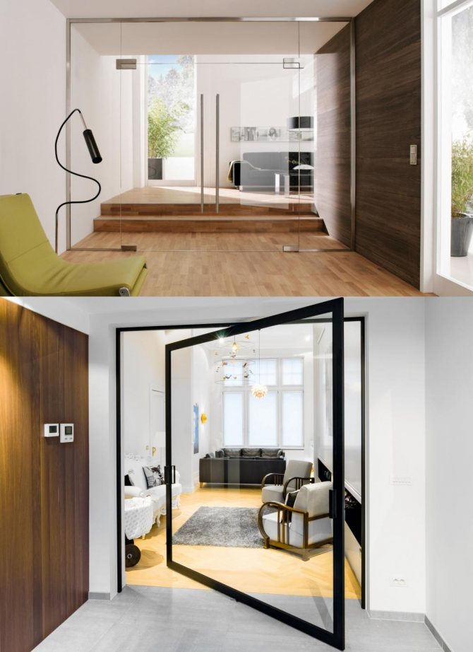Le principal avantage du système est que la structure s'ouvre à la fois vers l'intérieur et vers l'extérieur, ce qui est très pratique. Il est conseillé d'installer une porte pendulaire intérieure en verre pour les grandes pièces, de sorte qu'il y ait suffisamment d'espace libre devant et derrière. Mais le format de l'intérieur n'est pas important - il convient à la fois aux bâtiments résidentiels et commerciaux.