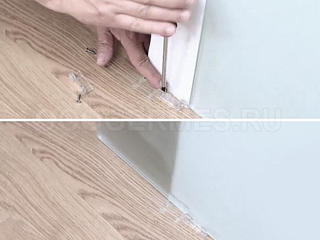 Pour éviter que la porte ne vibre par rapport au plan de l'ouverture, un guide en plastique spécial doit être fixé au sol à son bord même. Si la porte se ferme vers la gauche, le guide est monté sur le bord droit de l'ouverture et vice versa. Cette partie est fixée avec des vis autotaraudeuses. Si le sol est recouvert, par exemple, d'un stratifié, même un tournevis ordinaire convient à l'installation. Si le sol est en béton et non revêtu, vous devrez percer des trous pour les chevilles.