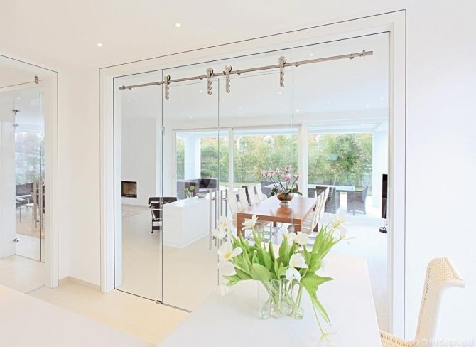 Dans un intérieur de maison, une porte intérieure en verre est un moyen de rendre un design individuel, de refléter le goût du propriétaire, ses valeurs et un regard sur l'esthétique architecturale. Ils augmentent visuellement l'espace libre des petites pièces, ajoutent le volume manquant à la pièce, la rendent aérée, épurée. Dans les grands appartements et chalets, il est judicieux d'installer une porte vitrée intérieure dans un souci de zonage soigné. Le verre vous permet de délimiter subtilement des pièces avec des intérieurs de styles différents ou de créer l'effet d'un seul espace. Dans les salles, cela donne l'impression d'une échelle de palais et d'immenses places (même si ce n'est pas le cas des places).