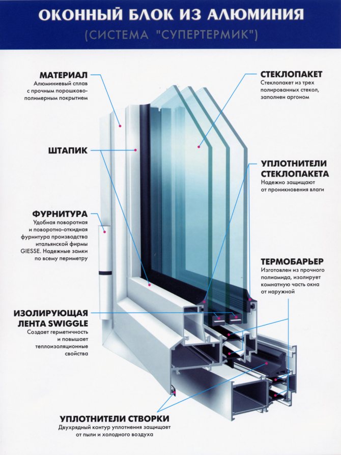 Il existe également des cadres en profilés d'aluminium chauds. Les structures de ces cadres sont multicouches. La surface des fenêtres en aluminium est non toxique, le profilé ne brûle pas, la pénétration de substances chimiquement actives à la surface du cadre en aluminium ne lui cause aucun dommage. La durée de vie de ces structures est d'environ 80 ans.