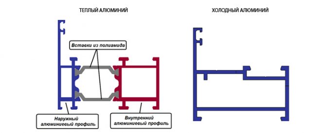 Les produits en aluminium sont divisés en 2 groupes: l'aluminium chaud et froid. En règle générale, un verre est installé dans des produits en aluminium froid ou dans un emballage à chambre unique avec une chambre à air ne dépassant pas 10 mm. Les produits se distinguent par leur légèreté, lors de l'installation, ils ne nécessitent pas de travaux supplémentaires avec une base de support. Ils peuvent être fabriqués dans des tailles suffisamment grandes. Ils protègent du vent, de l'humidité et de la poussière, réduisent légèrement le bruit de la rue et protègent légèrement contre les basses températures.
