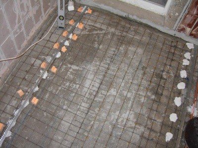 - Un treillis de renforcement en fil fin est posé sur le sol, des balises sont installées et fixées dessus. Sur un balcon ouvert, vous ne pouvez pas vous en passer, car dans tous les cas vous devrez régler le sens de l'eau vers le drain.