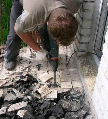 - Si la surface du balcon ouvert a une ancienne chape en ciment, elle doit être démontée. Cela doit être fait très soigneusement afin de ne pas toucher le poêle. Ce processus est mieux fait avec un perforateur.