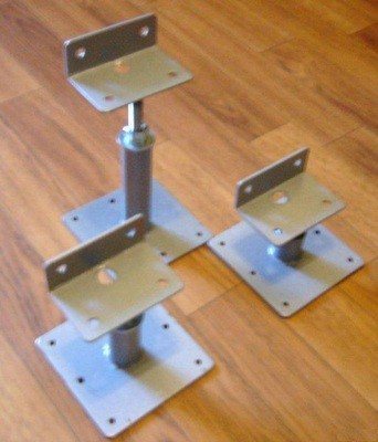 - Pour augmenter le décalage, des attaches réglables sont utilisées - ce sont des épingles métalliques, des supports, des supports ou des épingles en plastique. Tous ces éléments sont filetés, ce qui permet de surélever l'un des côtés à la hauteur souhaitée au-dessus de la dalle de béton.