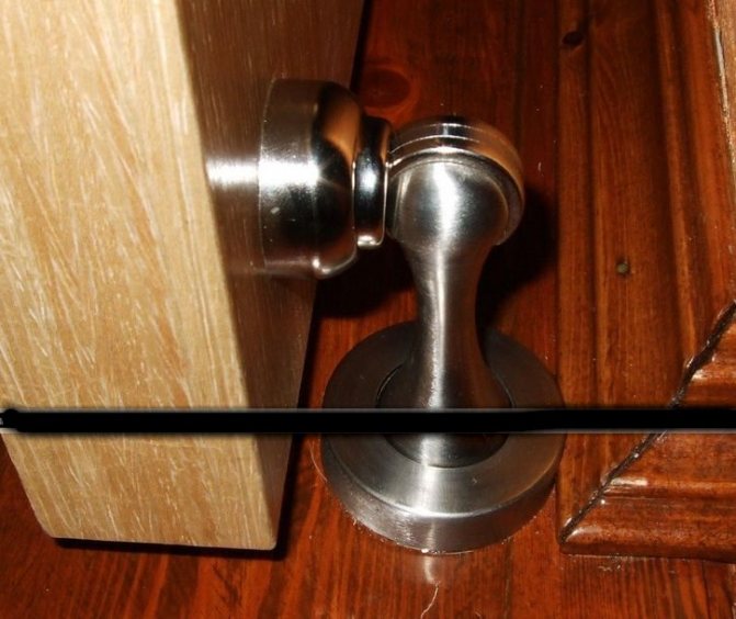- Retenue magnétique.Le principe de son fonctionnement est simple: une petite plaque métallique est vissée sur le vantail de la porte dans sa partie inférieure, et la butée elle-même avec un aimant est fixée au sol à l'endroit au-delà duquel la porte ne doit pas s'ouvrir. Lorsqu'elle est ouverte, la plaque est aimantée sur le bouchon et reste dans cette position.