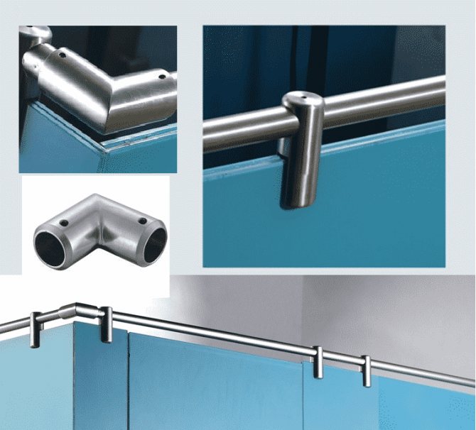 La fixation ponctuelle est effectuée en attachant la pince à la feuille de verre à travers un trou spécial. Un tel clip s'appelle un connecteur. Il est fabriqué en acier inoxydable. Sa conception contient un joint d'étanchéité, qui assure une excellente étanchéité de la connexion et protège la feuille de verre des dommages pendant le fonctionnement.