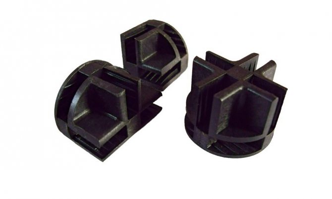Les liaisons des murs et cloisons de la vitrine sont réalisées avec un coin, une croix en forme de boule ou d'hémisphère. Les coins pour la fixation des vitrines en verre peuvent être doubles ou triples. L'angle entre les toiles doit être de 90 °.