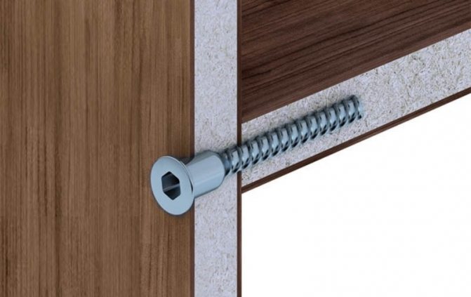 Nuance: en fonction de l'épaisseur des flancs, la longueur de la confirmation est sélectionnée. Pour une épaisseur standard de panneaux de particules et de MDF 16-18 mm, une vis Euro 5x50 est utilisée, pour les matériaux de panneaux plus épais - plus longs, jusqu'à 70 mm.