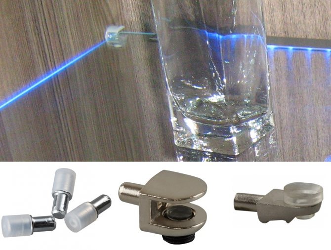 Si le corps de l'armoire lui-même est également en verre, un collage UV peut être utilisé pour la fixation. Également dans la gamme de ferrures pour étagères en verre, vous pouvez choisir des supports spéciaux avec fixation traversante. Dans ce cas, il est nécessaire de spécifier le diamètre des trous à percer (en règle générale, les fixations sont conçues pour une installation dans des trous de 5 ou 8 mm).