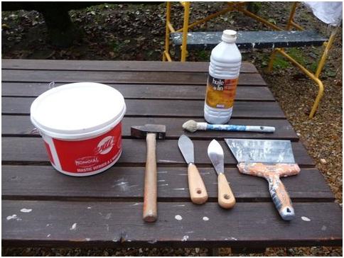 Pour remplacer le verre dans un cadre métallique, vous aurez besoin de l'équipement suivant: gants, spatule en feuille de laurier (courbée et plate), une boîte de mastic, un marteau, une large spatule, une brosse et de l'huile de lin.