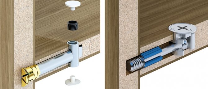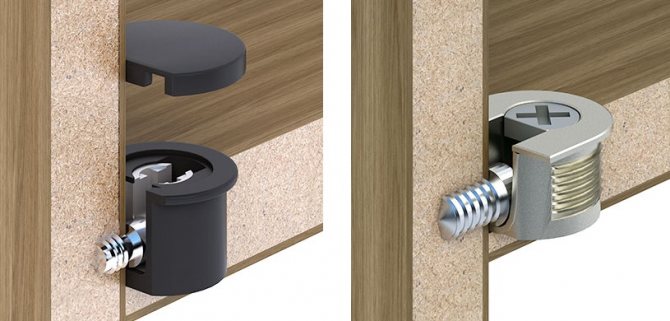 Les confirmations sont les fixations traversantes les plus courantes. Pour l'installation, vous devrez percer un trou à l'extrémité de l'étagère d'un diamètre de 5 mm et de la face avant du côté de l'armoire avec une perceuse d'un diamètre de 8 mm.Il est préférable d'utiliser un exercice de confirmation spécial. Puisqu'un fraisage est également nécessaire sous la tête, la vis elle-même affleure la surface de la paroi latérale. De plus, le chapeau est caché par un bouchon auto-adhésif spécial, assorti à la couleur de l'aggloméré.