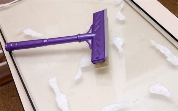 La prochaine étape: le film est décollé de la doublure (il est préférable de le faire ensemble), après quoi sa surface adhésive est également humidifiée avec de l'eau savonneuse. Ensuite, le film est placé avec la face adhésive sur le verre. Il ne reste plus qu'à chasser l'eau d'en dessous; cela se fait en faisant glisser un chiffon sec ou une carte en plastique du centre vers l'extérieur.