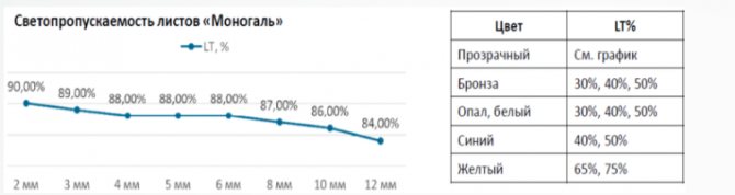 Transmission lumineuse du plastique monolithique dépend de l'épaisseur du matériau, aucune autre caractéristique technique n'a d'influence sur celui-ci. La couleur compte également, mais c'est la version monolithique qui est généralement utilisée complètement incolore, car elle est idéale pour le verre et les cloisons. Pour la version incolore, les indicateurs seront les suivants: